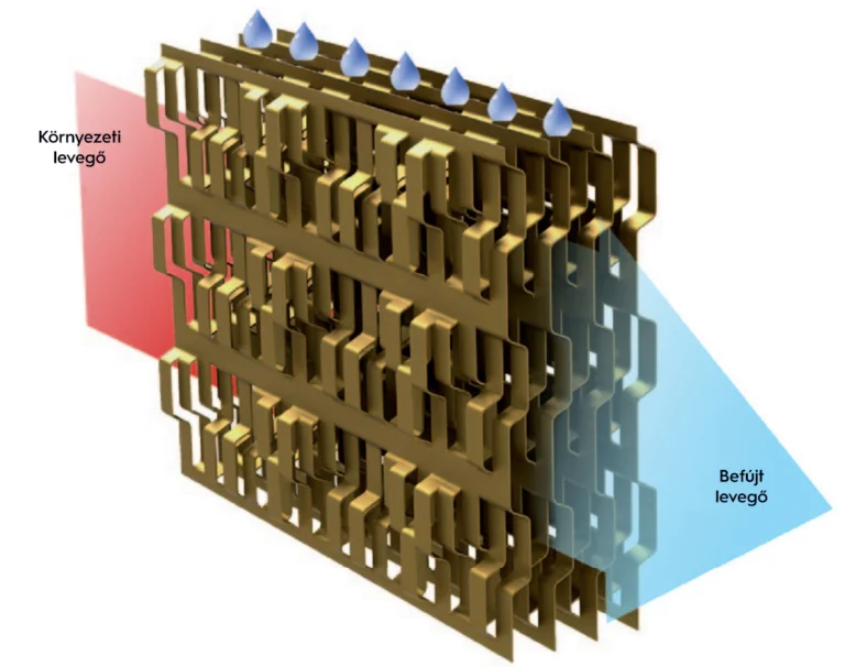 módszer, amely lehűti és nedvesíti a légáramot. A hűtési idény alatt a forró szívott (kültéri) levegő átáramlik a nedves