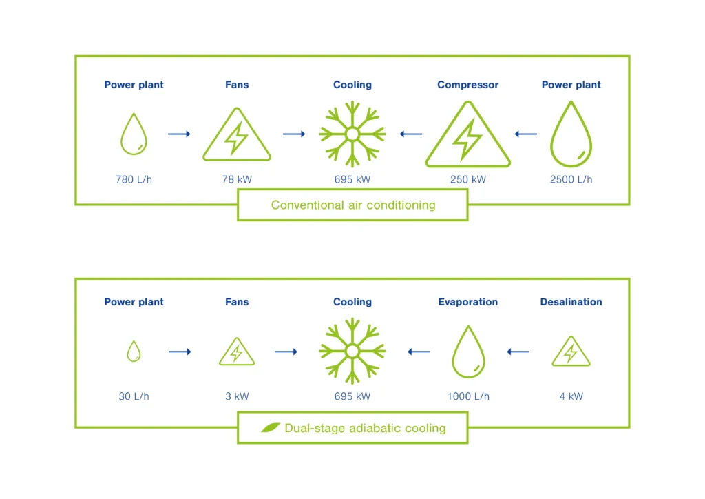 Ami a vízfogyasztást illeti, példának okáért az IntrCooll kétkörös adiabatikus hűtőrendszer óránként mindössze 1 m3 vizet igényel 695 kW hűtőteljesítmény biztosításához.