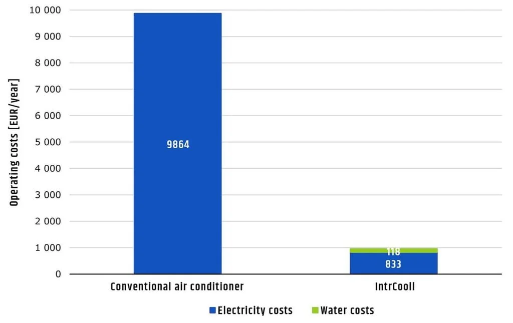 A fent leírtak szerint az IntrCooll kétkörös adiabatikus hűtőrendszerben a párologtatási folyamatot szabályozó ventilátornak 1 kWh villamos energiára volt szüksége ahhoz, hogy 40 kWh hűtési teljesítményt és folyamatos-szabad szellőzést biztosítson.