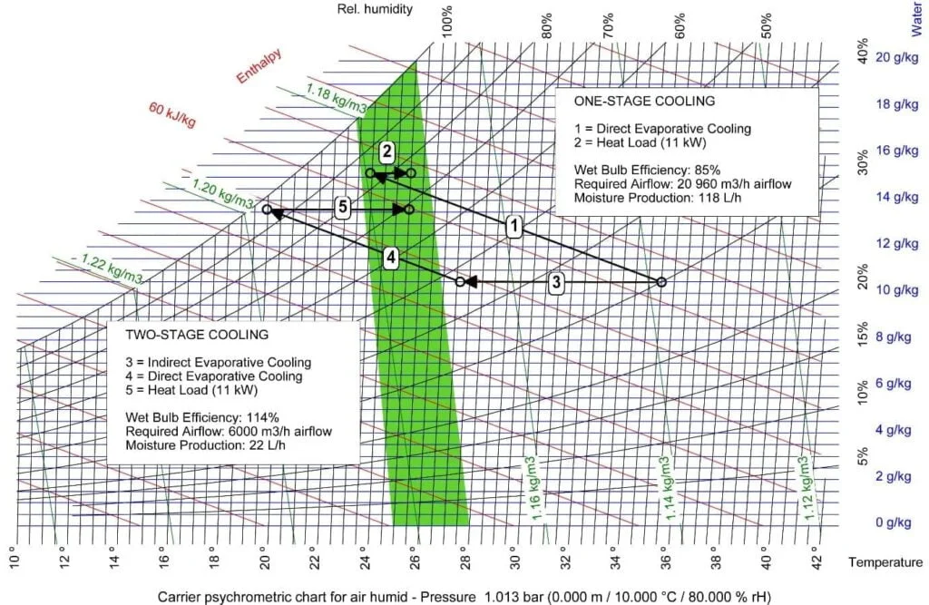 Az ábra egy példát mutat egy direkt (egykörös) adiabatikus hűtési folyamatra az indirekt/direkt (kétkörös) adiabatikus hűtési folyamathoz képest 35 °C-os kültéri levegővel és 30%-os relatív páratartalommal. Látható, hogy a direkt (egykörös) adiabatikus hűtési folyamat magasabb páratartalmú beltéri levegőt eredményez, mint a kétkörös adiabatikus hűtési folyamat (~75% vs. ~65%), ha 25C belső hőmérsékletre temperálunk a térben. Továbbá, az egykörös párologtató hűtési folyamat párolgási hatásfoka alacsonyabb, mint a kétkörös párologtató hűtési folyamaté (85% vs. 114%). Végül, az egykörös adiabatikus hűtési folyamat esetében az azonos hőterhelés (11 kW) mellett azonos 25 °C-os belső hőmérséklet eléréséhez szükséges légáram több mint háromszor nagyobb (20 960 m3 /h vs. 6000 m3 /h). Ez azt jelenti, hogy az egykörös adiabatikus hűtési folyamat során befújt abszolút nedvességtartalom több, mint ötször nagyobb (118 L/h vs. 22 L/h).