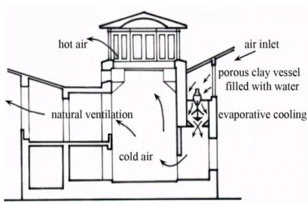 Nem használhattak elektromos ventilátorokat vagy más modern technikákat, de a párologtató hűtés elemeit beépítették a lakóépületek tervezésébe és építészetébe, hogy egyfajta belső klímaszabályozást biztosítsanak. Ezen kívül a nedves rongyokat használó párologtató hűtés egy széltoronnyal (szélfogóval) kombinálva hagyományos iráni építészeti elem az épületek hűtésének biztosítására.